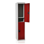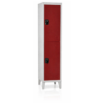 Vestiaire métallique avec 2 portes et séparation horizontale, idéal pour ranger les effets personnels. Disponible avec option sur pieds.