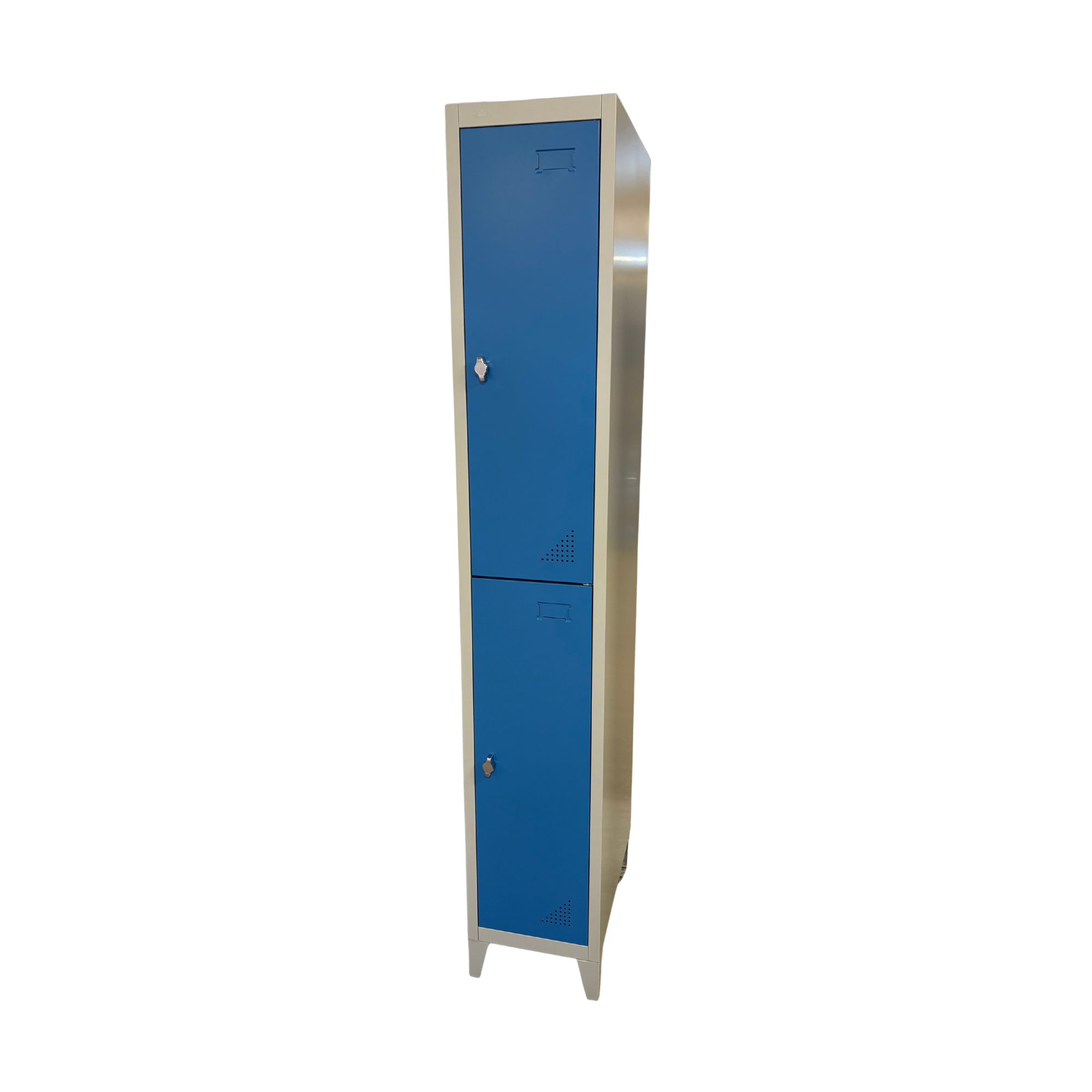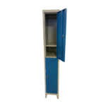 Vestiaire métallique avec 2 portes et séparation horizontale, idéal pour ranger les effets personnels. Disponible avec option sur pieds.
